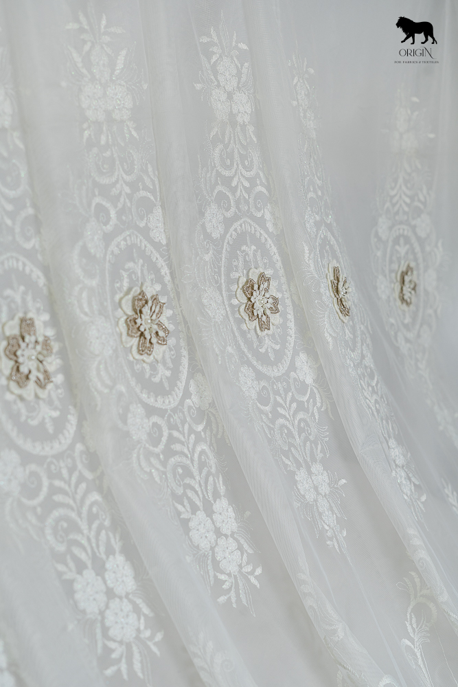 ستارة أورجن جبير مطرز بمقاس 4 متر عرض و 2.70 متر ارتفاع، تتميز بتصميم فاخر وخامات ناعمة توفر مظهراً عصريًا. تتميز بتطريزات رائعة تضفي لمسة من الفخامة، وتأتي بنظام الحلقات الكبس الجاهز للتركيب، أو نظام الشريط.