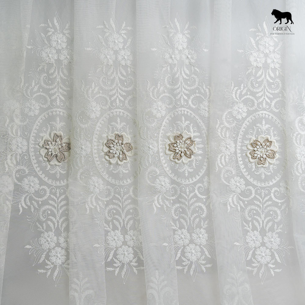 This embroidered organza tulle curtain, measuring 3 meters in width and 2.70 meters in height, features a luxurious design and soft fabrics that provide a modern look. It is adorned with exquisite embroidery that adds a touch of sophistication and comes with either a ready-to-install grommet system or a tape system.
