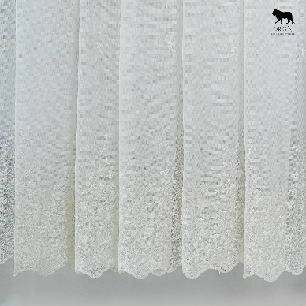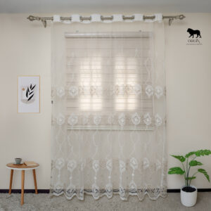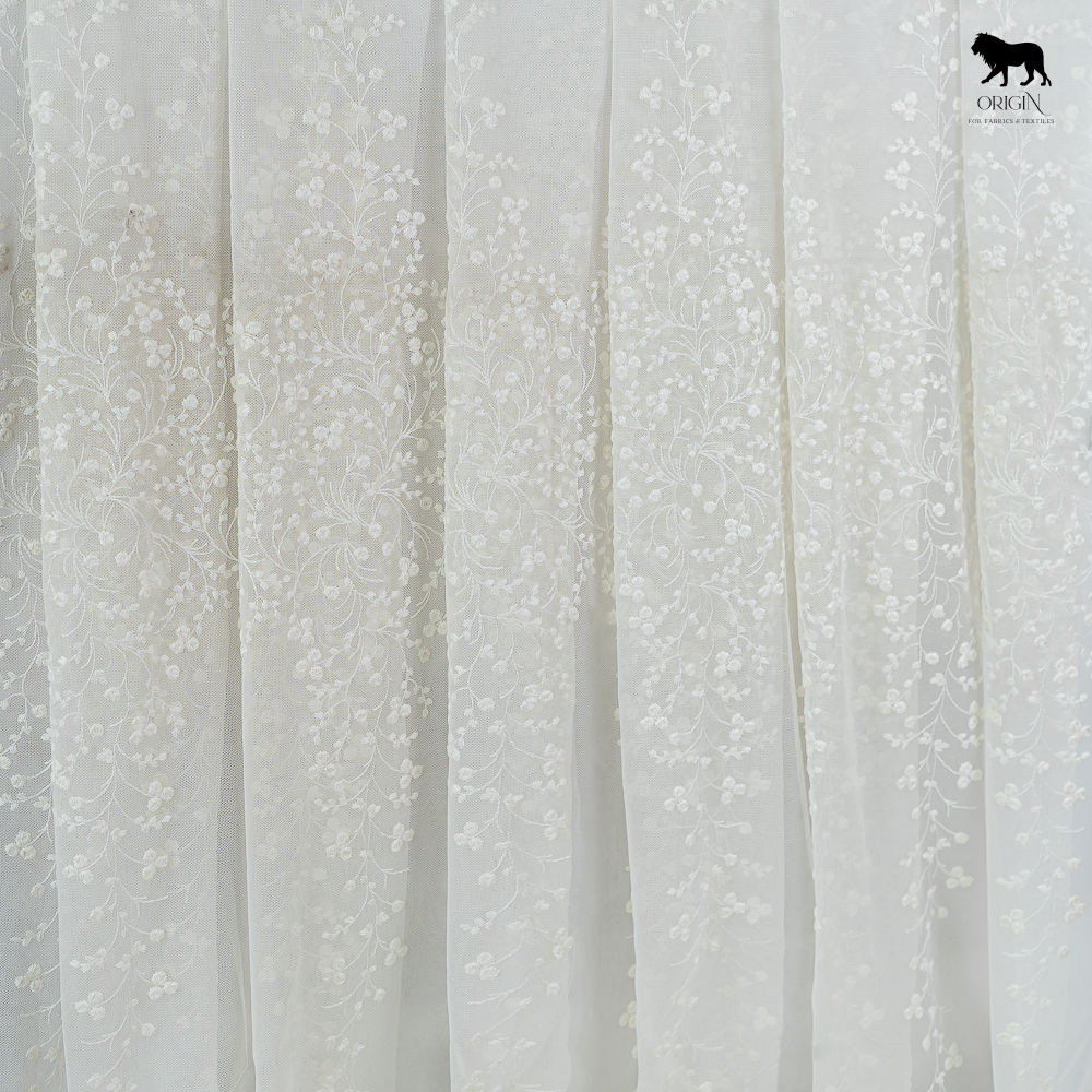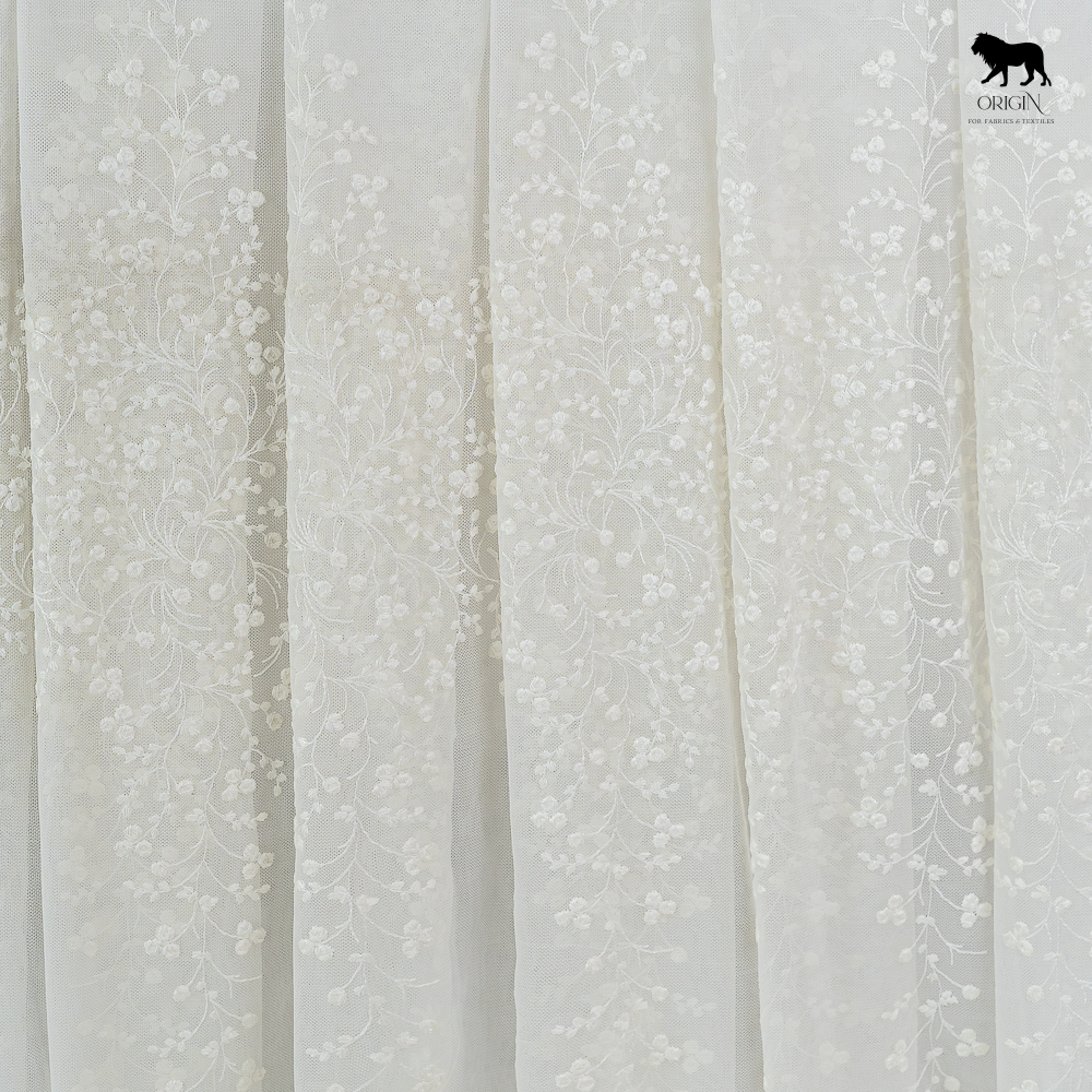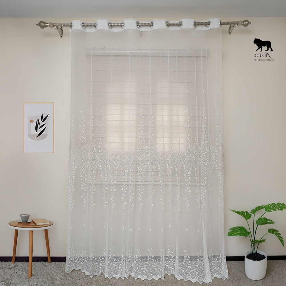 This embroidered organza tulle curtain, measuring 3 meters in width and 2.70 meters in height, features a luxurious design and soft fabrics that provide a modern look. It is adorned with exquisite embroidery that adds a touch of sophistication and comes with either a ready-to-install grommet system or a tape system.